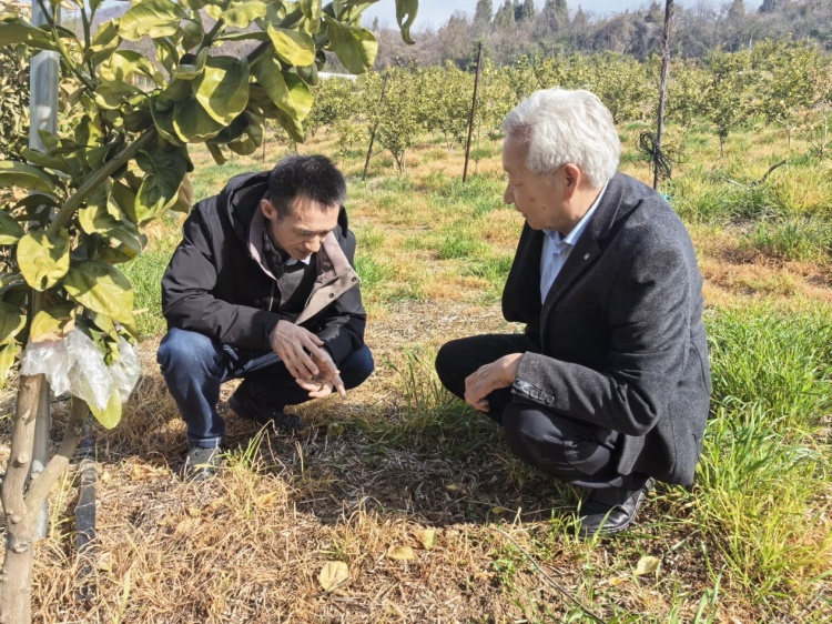 专家团队实地查看了柑橘树生长、灌溉和施肥情况。针对去年冬季至今,部分柑橘树冻伤的问题,专家团队现场采取土壤样本进行抽检后提出了开沟排水等建议,并对有机肥发酵给出了技术指导。