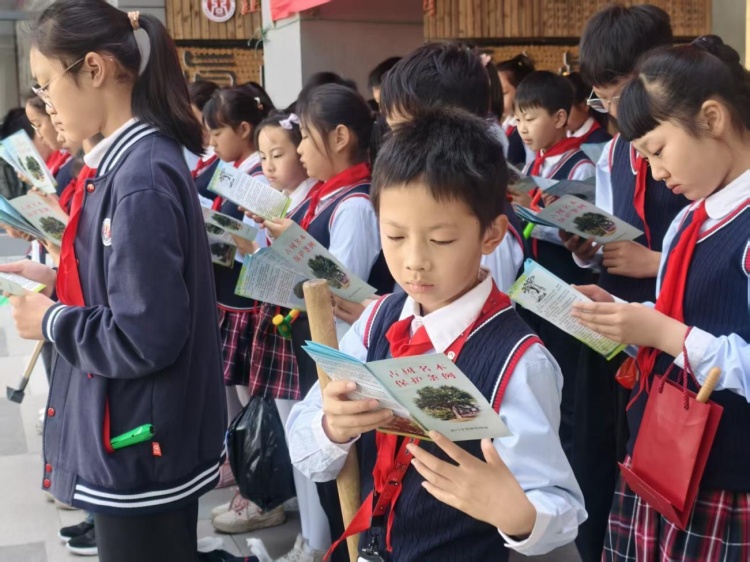 4月15日,荆门市科协联合市园林科研所赴荆门实验小学开展 “守护年轮记忆,传承绿色文明” 古树名木科普活动。150 名师生认真聆听《古树名木保护条例》法规宣讲,积极参与古树复壮养护实操,为校园百年紫薇古树构建生态保护空间,在 “自然课堂"”中深化对古树双重价值的认知理解。