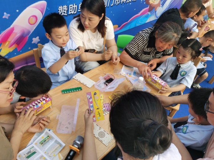 最受欢迎的当属公益课堂制作迷你电子琴环节。在科普志愿者的指导下,家长和孩子分工合作,孩子专注拼接零件,家长帮忙检查线路,共同完成迷你电子琴的制作。当亲手制作的电子琴发出悦耳的声音,孩子们兴奋地与家长击掌庆祝。