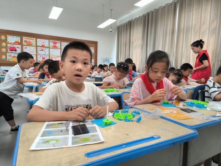 在了解了基本原理后,活动进入了最令人兴奋的实践环节。同学们在科协工作人员、学校老师及志愿者的耐心指导和协助下,兴致勃勃地开始组装属于自己的“太阳能旋转飞椅”。从辨认零件、连接电路到固定结构,每一个步骤都充满了探索与合作的乐趣。当一件件作品在阳光下成功旋转起来时,现场爆发出阵阵欢呼与掌声,成功的喜悦洋溢在每一位“小科学家”的脸上。