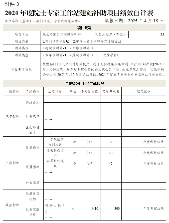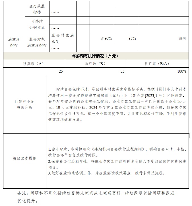 院士专家站建站补助经费项目绩效自评综述:项目全年预算数为25万元,执行数为25万元,完成预算100%。主要产出和效益:一是专家团队来荆次数34次数;二是开展科技培训20次数;三是取得科技成果47次数;四是吸纳农民务工300次数;发现的问题及原因主要是:财政资金保障不足,导致服务对象满意度指标不高。根据《荆门市人才引进培养使用一揽子支持措施实施细则(试行)》(荆办发[2023]1号)文件规定,每年对考核合格的企业院士工作站、企业专家工作站一次性分别给予企业20万元、10万元建站补助。2024年度有5家企业专家工作站考核合格,但每家专家工作站仅拨付5万元,部分企业满意度下降,企业建站积极性下降,不利于我市营商环境健康发展。下一步改进措施:1.由市财政、市科协确定《建站补助资金拨付流程细则》,明确资金申请、审核、拨付各环节责任及拨付时限。2.保障资金供给稳定性,将院士专家工作站补助资金纳入年度财政预算优先保障项目。3.做好企业沟通协调工作,为企业解读政策要点、拨付条件及流程。